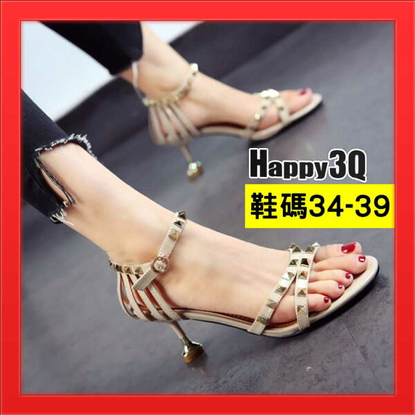 高跟鞋涼鞋細跟中跟鞋鉚釘一字扣性感百搭個性後空露腳趾-黑/米34-39【AAA2419】